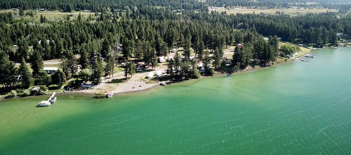 Drone still photo - lakefront view of Fircrest Lakeside RV Resort, Lac La Hache BC
